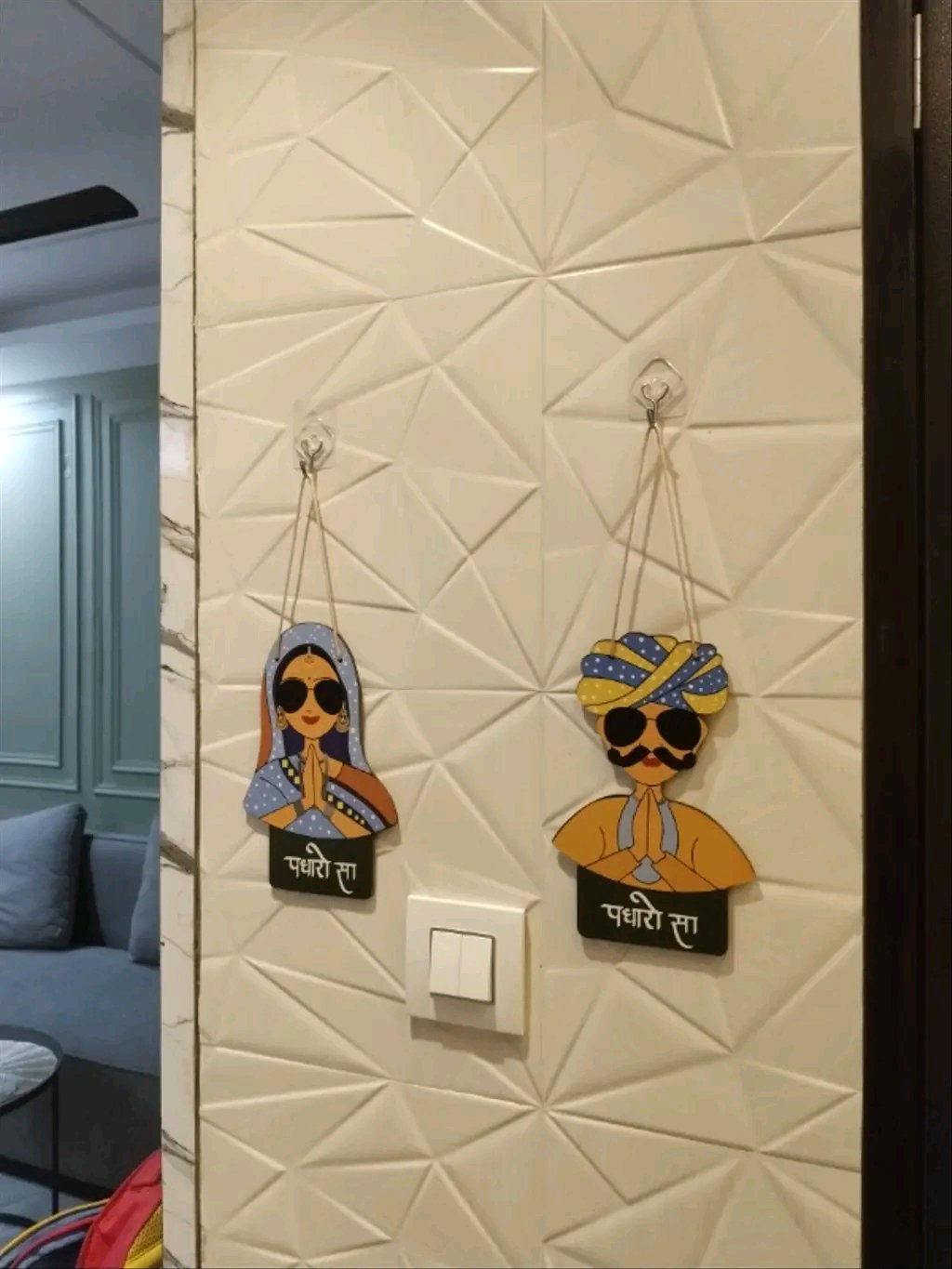 - Traditional Design: Inspired by Rajasthan’s rich culture, the wall hanging showcases a man in a turban and a woman in a ghagra-choli, both wearing sunglasses for a trendy twist.